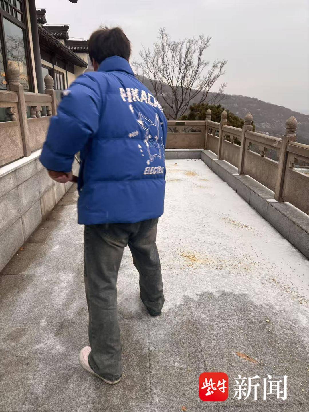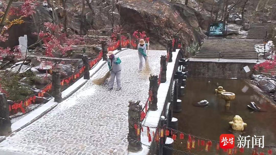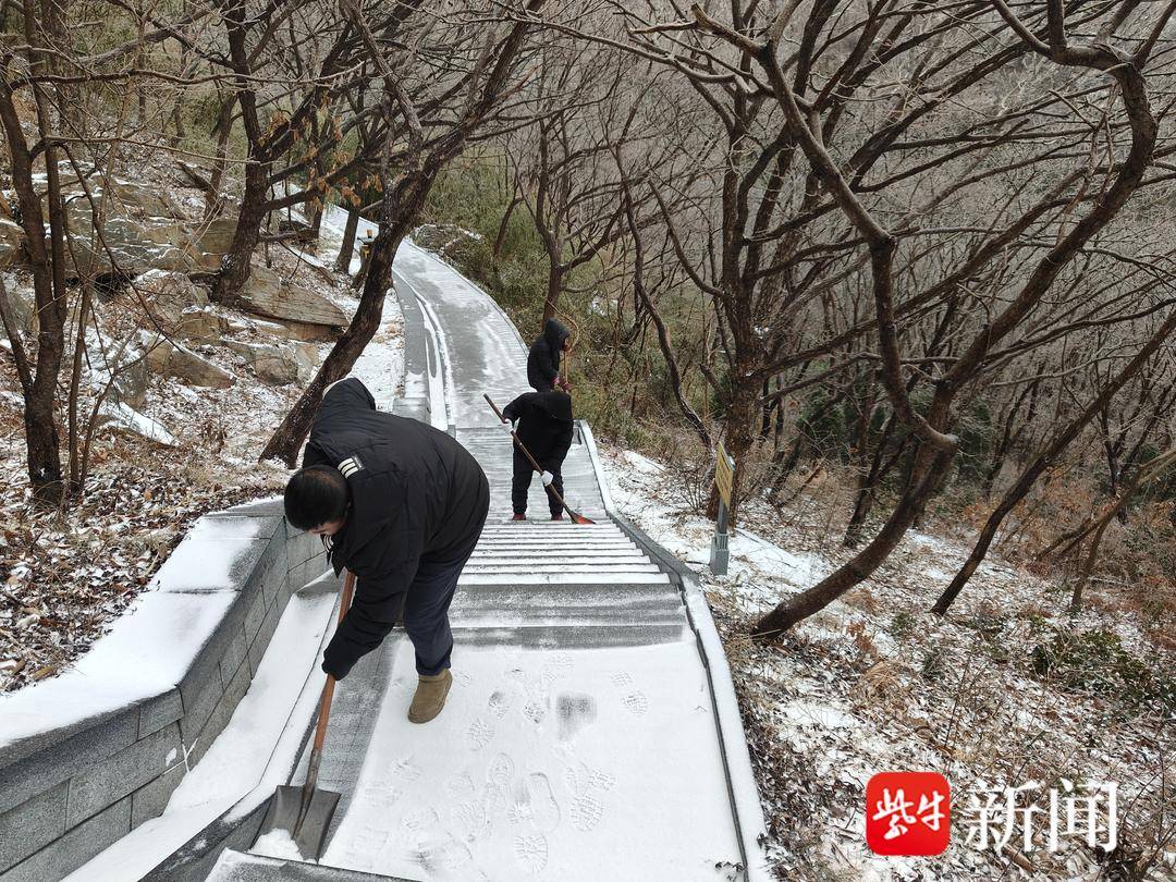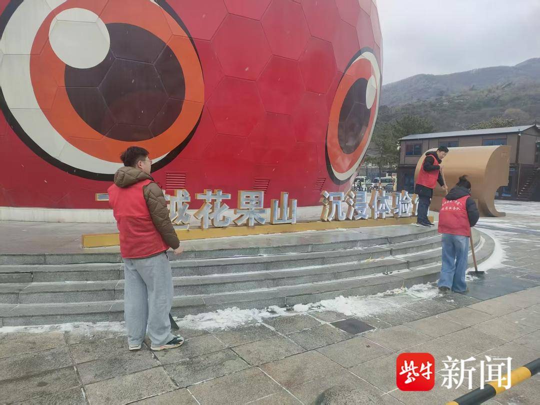在花果山景区,花间岭·悟云空民宿的责任主说念主员徒步登山、冒雪功课,撒融雪剂、清结冰大地,用脚步丈量包袱,用执着服从讲授着“工作至上”的理念。