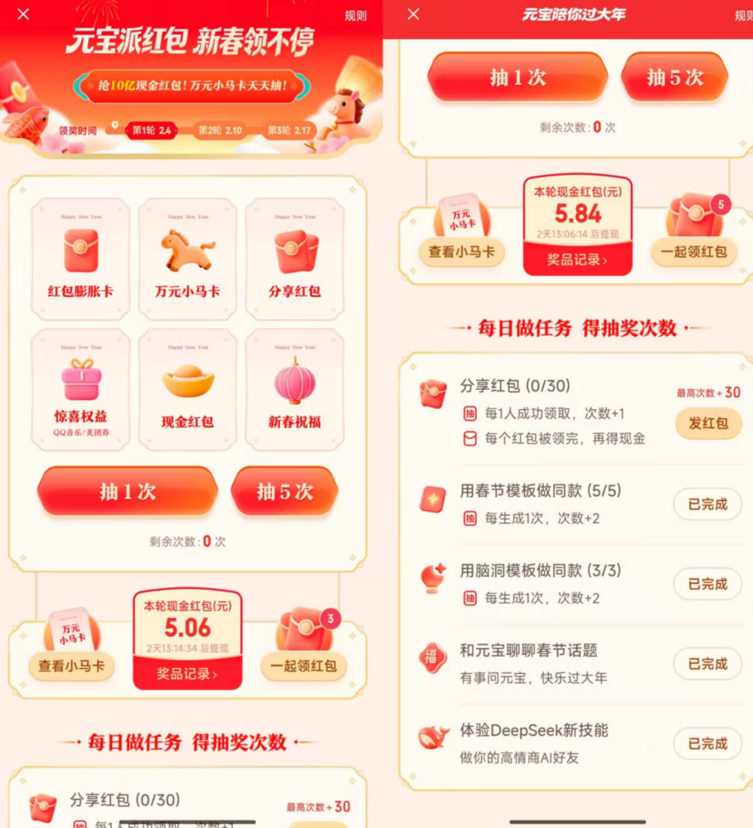用户不错通过使用元宝“用春节模板作念同款”“用脑洞模板作念同款”以及“与元宝聊春节话题”等功能获取拆红包次数,但计较次数有限。
