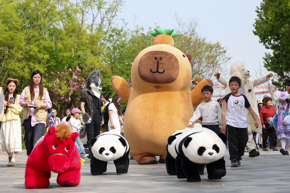 4月4日,游客在湖北省襄阳市华裔城魔幻谷景区不雅看神奇动物大迁移巡游扮演。新华社发(杨东 摄)