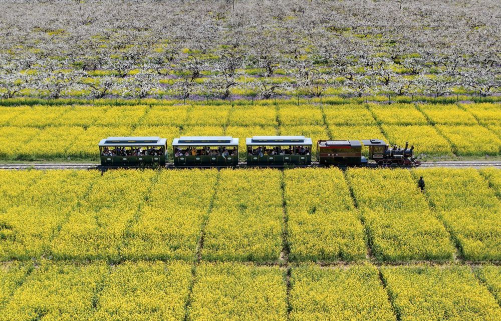 4月6日,游客乘不雅光小火车从河北省晋州市周家庄乡第九坐蓐队戏班旁经由(无东说念主机像片)。新华社记者 杨世尧 摄
