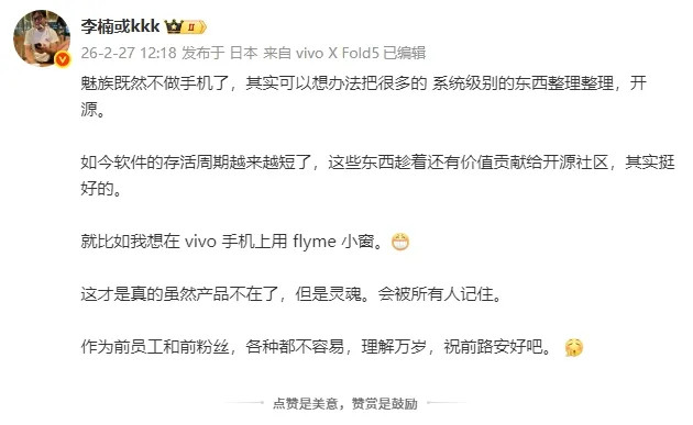 随后人人王人来蹭热度。酷比魔方官微问要不要适配Flyme ↑,魅族前高管李楠↓ 则但愿魅族开源,让vivo能用上魅族的小窗。