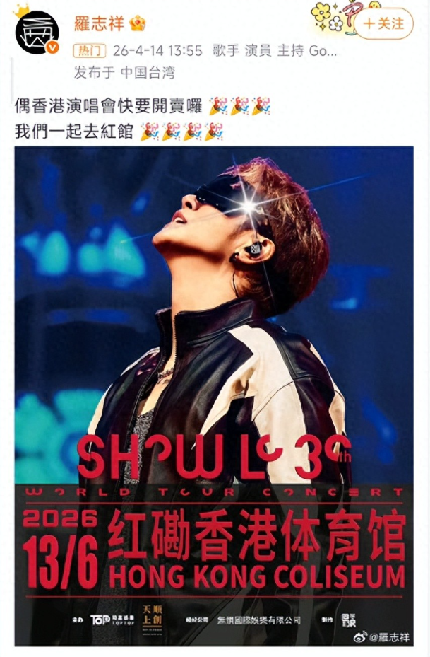 网传音尘熟谙坏心握造。而更具戏剧性的是,4 月 14 日下昼,罗志祥本东说念主躬行下场,在微博上用象征性的亲民口吻发文:“偶香港演唱會将近開賣囉 我們一王人去紅館!” 这份出乎预感的官宣,不仅用实质行动打脸了暴毙神话,更将公论热度推向新的岑岭。