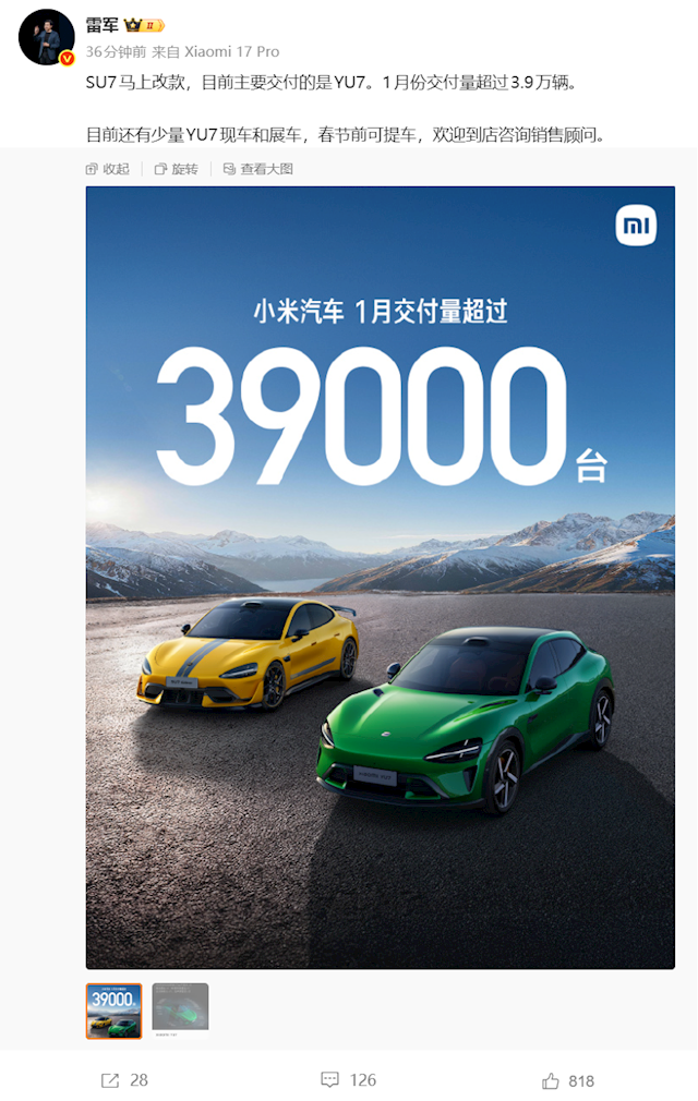 快科技2月1日音问,小米汽车官方晓谕,1月份委用辆朝上39000台。