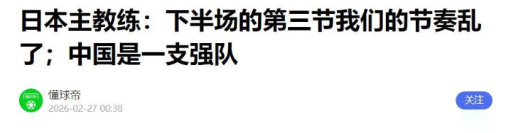 懂球帝官方——日本主素养:下半场的第三节咱们的节律乱了;中国事一支强队