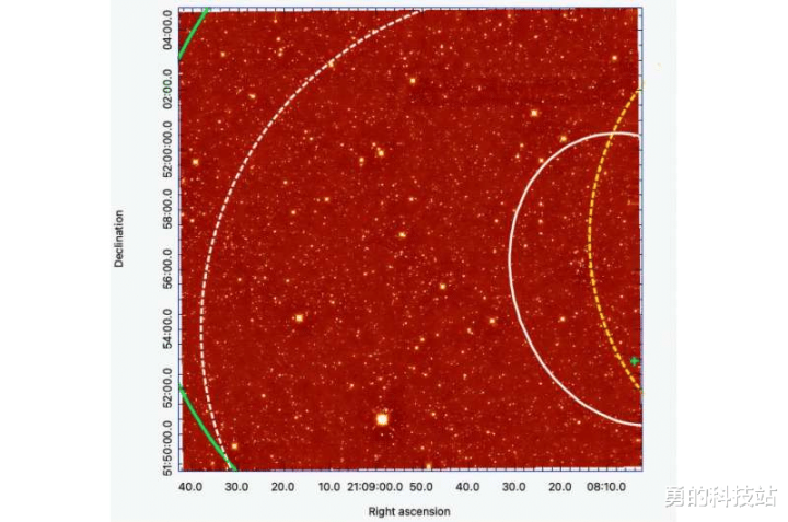 在Ks滤波器中,LHAASO近红外场J2108+5157。重迭的是费米-LAT(白色椭圆)、HAWC(绿色椭圆)和LHAASO(分歧用于KM2A和WCDA探伤器的白色和黄色虚线椭圆)探伤的部分置信区。射电候选微类类星体的位置与所有VHE/UHE探伤一致,并用绿色叉标记。图片起首:arXiv