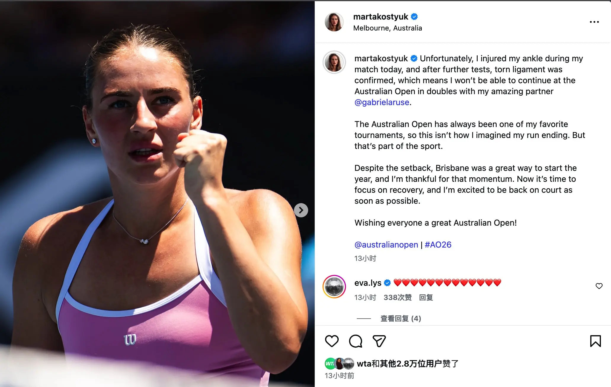 北京时辰2026年1月18日,乌克兰名将科斯秋克在澳网女单首轮资格了一场三小时三十一分钟的苦战,最终在三个抢七大战后不敌法国小将雅克莫。比赛末段,科斯秋克在一次跑动中跌倒,赛后确诊为韧带扯破,她也因此退出了女双比赛。这位一周前刚在布里斯班站连克三位天下前十并闯入决赛的乌克兰好意思女,在澳网开赛第一天就遇到了现象暖热运的双重逆转。