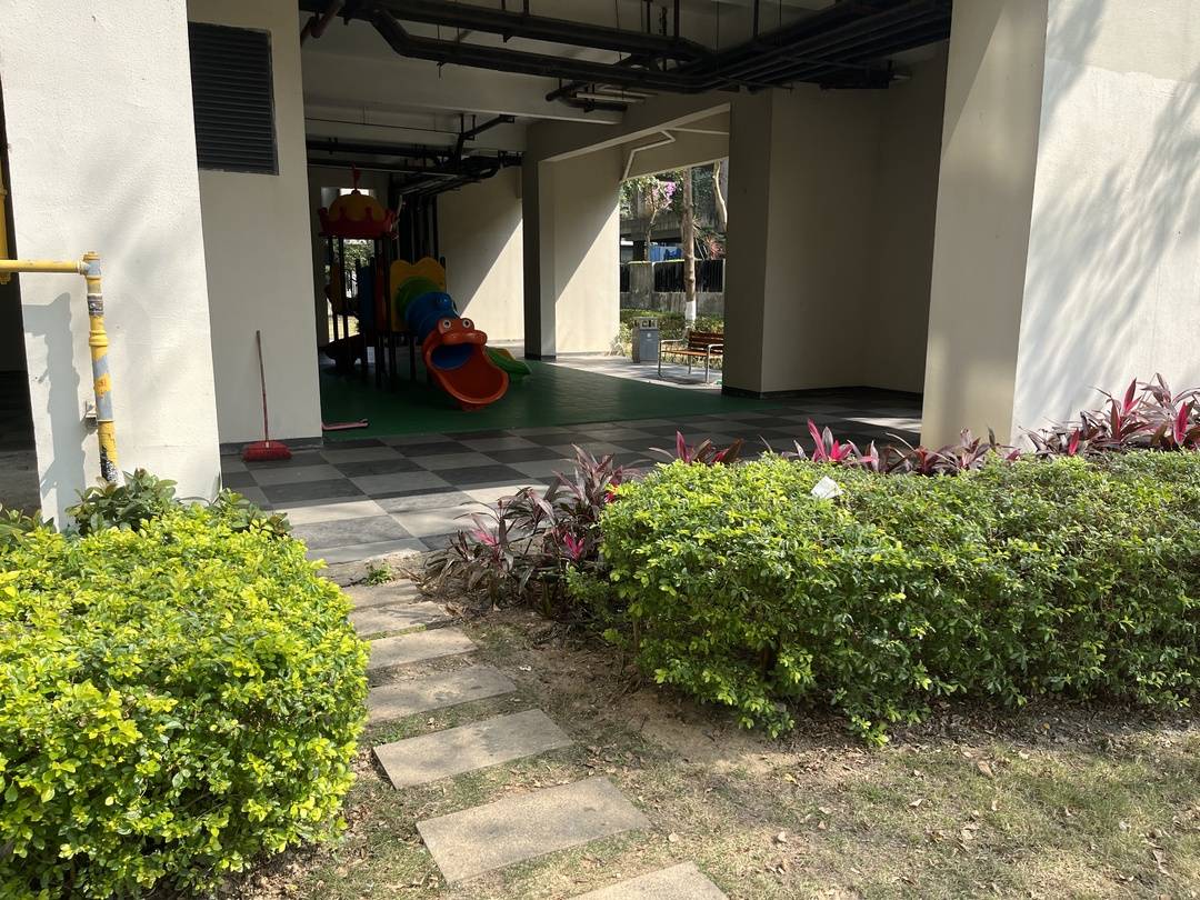 曾被投放有毒猪肉碎的小区草坪,一旁是儿童文娱门径。受访者供图