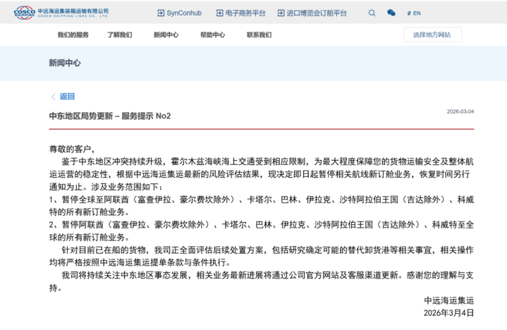 亚搏app官方网站 中远海运集运: 鉴于中东地区松弛合手续升级, 霍尔木兹海峡海上交通受限, 即日起暂停关系航路新订舱业务