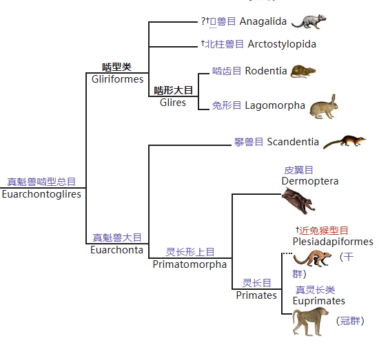 同理,双门齿上目包含了兔形目,及啮形大目中一经死灭的、比拟于现有啮齿目动物的最近共同祖宗、更接近兔形目的成员。