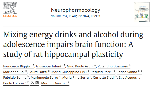 [2] Mixing energy drinks and alcohol during adolescence impairs brain function: A study of rat hippocampal plasticity. Neuropharmacology. Volume 254. 2024. 109993. ISSN 0028-3908. doi:10.1016/j.neuropharm.2024.109993