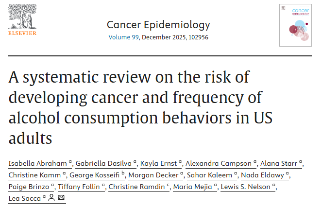 [1] Isabella Abraham, Gabriella Dasilva, Kayla Ernst, et al. A systematic review on the risk of developing cancer and frequency of alcohol consumption behaviors in US adults. Cancer Epidemiology. Volume 99. 2025 Dec.102956. ISSN 1877-7821. doi:10.1016/j.canep.2025.102956