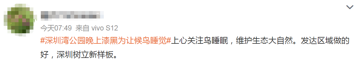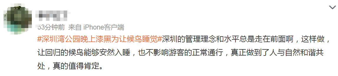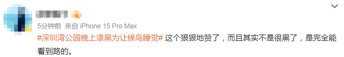 该网友示意,我方陪外地来的亲戚逛深圳湾公园时,被问住了。“晚上公园如何黑漆漆的?这样好的公园,沿着海边吹吹风,又能骑车又能分布,但一齐都没什么灯。为什么不装几盏亮小数的灯,让夜晚更明亮一些呢?”