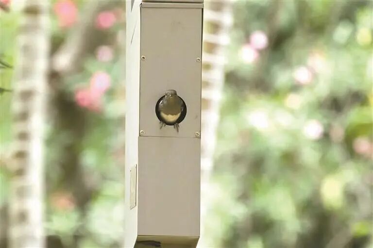 生物千般性友好街灯上的东谈主工鸟巢成为鹊鸲的“新家”。 受访单元供图