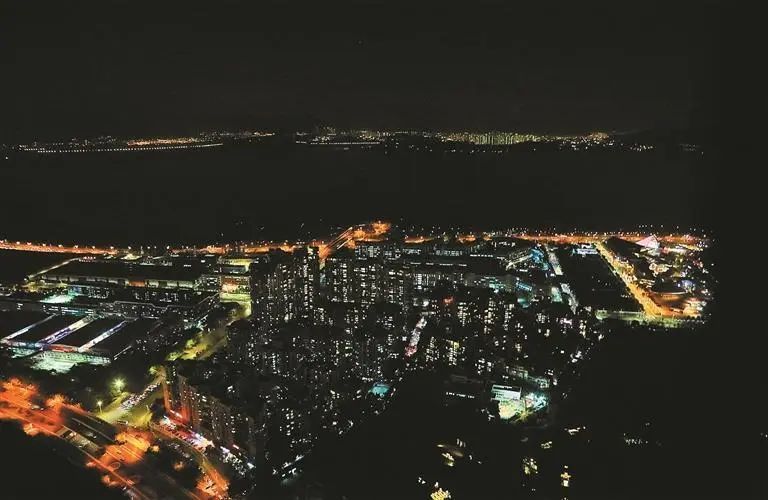 夜色中的深圳湾上空,辽远的深圳湾公园插足“暗夜”。深圳晚报记者 李晶川 摄
