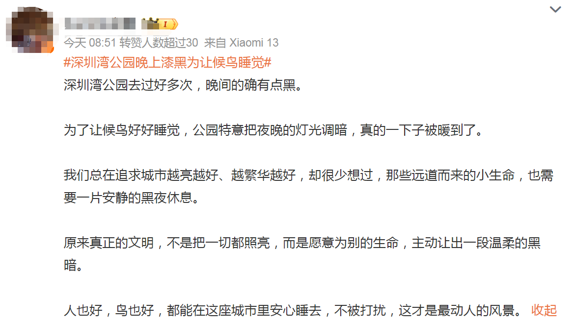 据先容,深圳湾公园地处公共九大候鸟迁移道路之一的东亚-澳大利西亚迁飞线中点,这片咸淡水交织的湿地,是候鸟迁移途中不能或缺的“补给站”,增设过多高亮度灯具,会梗阻深圳湾的当然生态均衡,搅扰候鸟的越冬栖息与迁飞节奏。