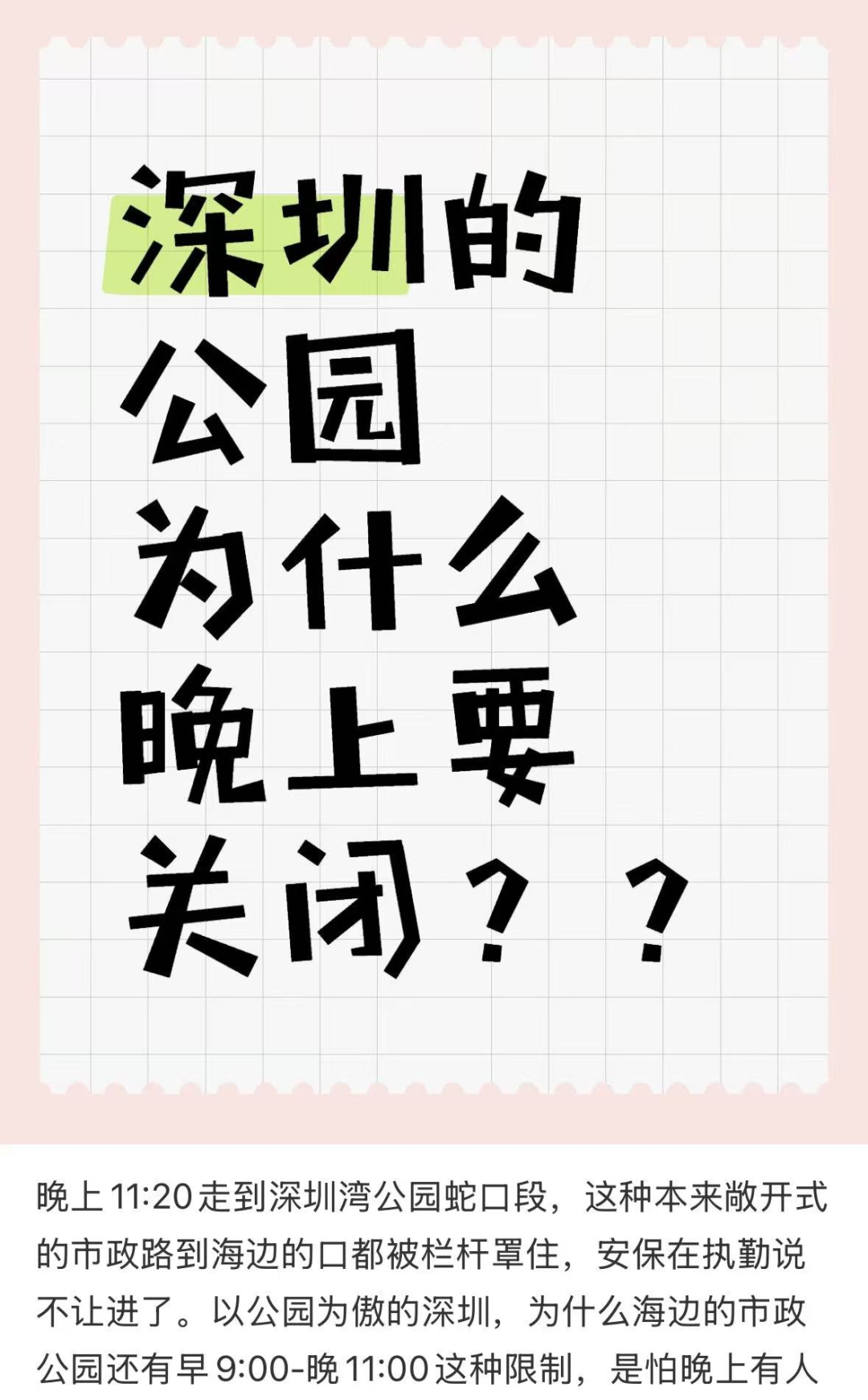 “深圳好多海滨公园晚上闭园太早,能否将阻塞措置的公园等城市空间大开?”