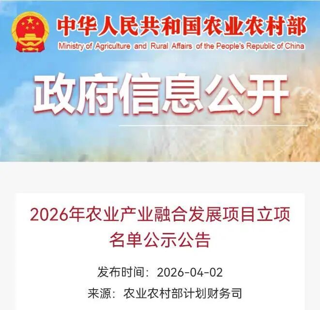 4月2日,农业农村部遐想财务司发布2026年农业产业交融发展容貌立项名单公示公告,按照《农业农村部办公厅 财政部办公厅对于作念好2026年农业产业交融发展容貌申诉职责的见知》(农办计财〔2026〕2号)条目,已按活动完成2026年农业产业交融发展容貌立项评审职责,将拟批准立项名单进行公示。